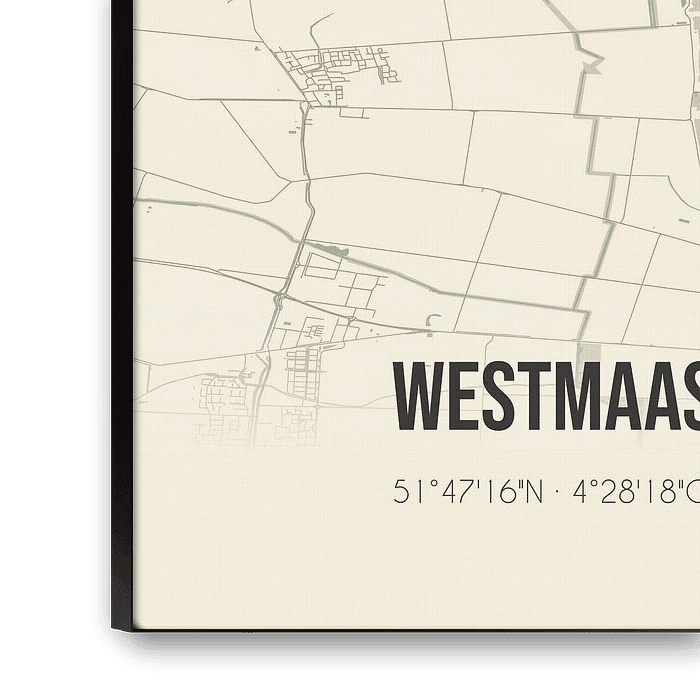 Retro map of Westmaas, located in the municipality of Hoeksche Waard, province of South Holland. The map shows public roads, watercourses (lakes, streams and ditches) and forests in and around Westmaas. In addition, the map contains the coordinates of Westmaas.