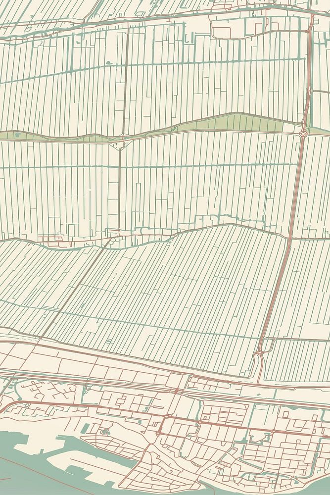 Retro map of Wijngaarden, located in the municipality of Molenlanden, province of South Holland. The map shows public roads, watercourses (lakes, streams and ditches) and forests in and around Wijngaarden. In addition, the map contains the coordinates of Wijngaarden.