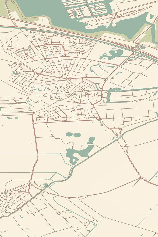 Retro map of Winschoten, located in the municipality of Oldambt, province of Groningen. The map shows public roads, watercourses (lakes, streams and ditches) and forests in and around Winschoten. Furthermore, the map features the coordinates of Winschoten.