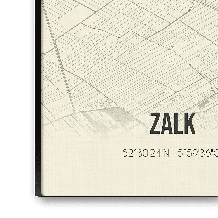 Retro map of Zalk, located in the municipality of Kampen, province of Overijssel. The map shows public roads, watercourses (lakes, streams and ditches) and forests in and around Zalk. In addition, the map contains the coordinates of Zalk.