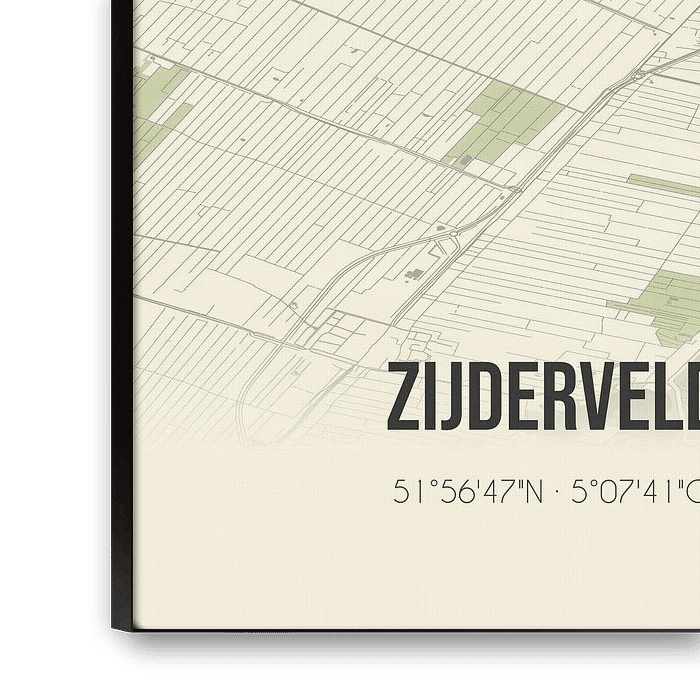 Retro map of Zijderveld, located in the municipality of Vijfheerenlanden, province of Utrecht. The map shows public roads, watercourses (lakes, streams and ditches) and forests in and around Zijderveld. In addition, the map contains the coordinates of Zijderveld.