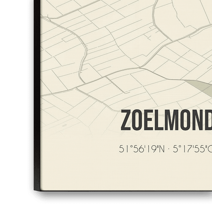 Retro map of Zoelmond, located in the Betuwe, in the municipality of Buren, province of Gelderland. The map shows public roads, watercourses (lakes, streams and ditches) and forests in and around Zoelmond. In addition, the map contains the coordinates of Zoelmond.