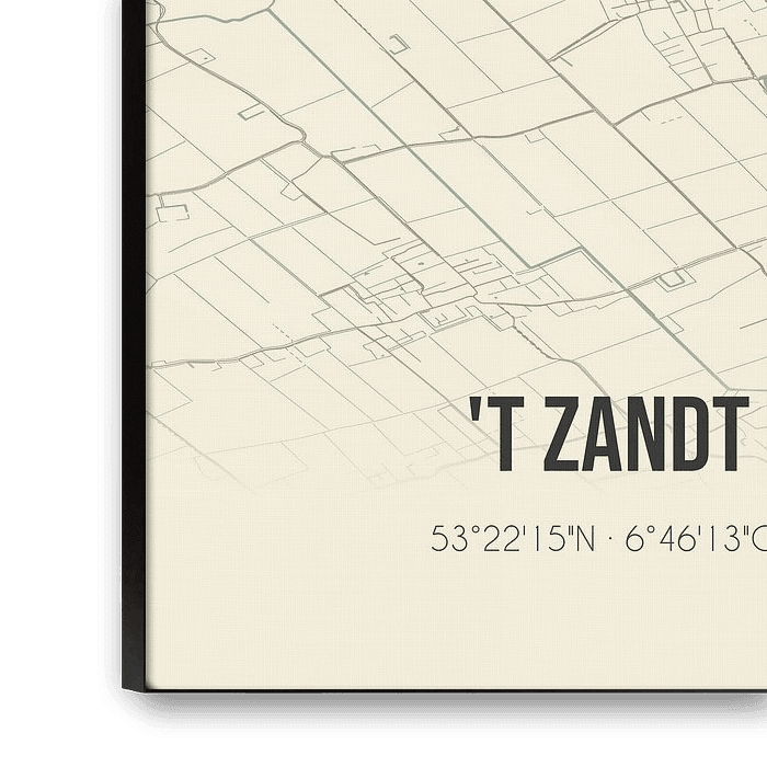Retro map of 't Zandt, located in the municipality of Loppersum, Groningen province. The map shows public roads, watercourses (lakes, streams and ditches) and forests in and around 't Zandt. In addition, the map contains the coordinates of 't Zandt.