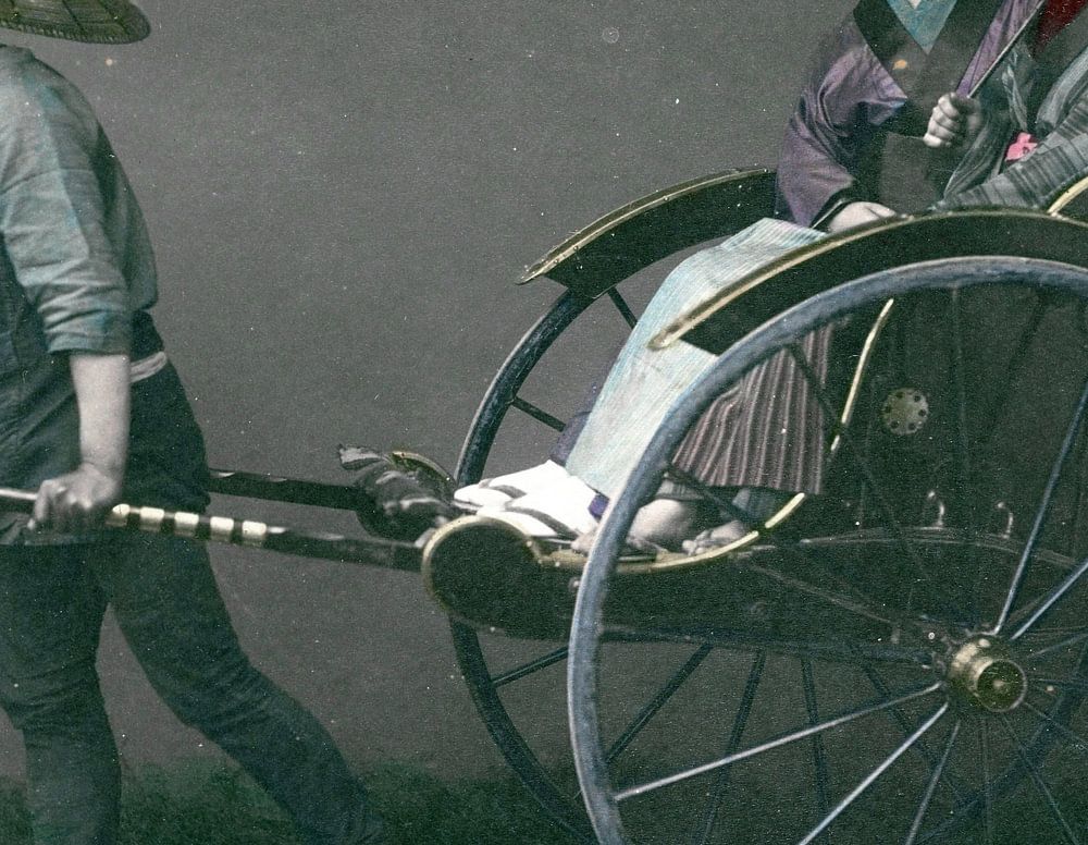 A Jinrikishia or also trishaw is a light two-wheeled cart, usually pulled by one man. Here two passengers, two women are sitting in the vehicle, an Asian taxi. The coloured picture has after yellow and red quite a lot of green.