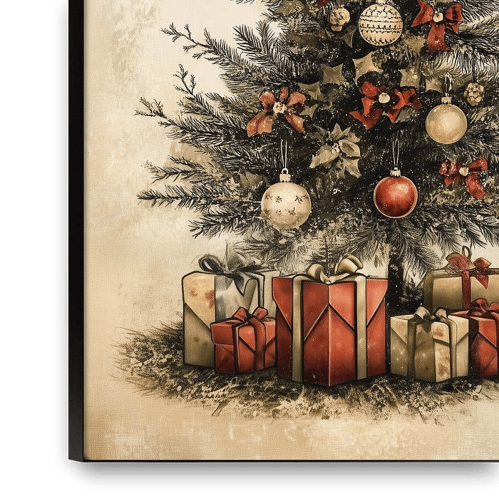 Buy this digital art artwork Vintage retro Christmas tree with presents - sepia nostalgia by Mel Digital Art as a reproduction on canvas, ArtFrame, poster and wallpaper, printed on demand in high quality.