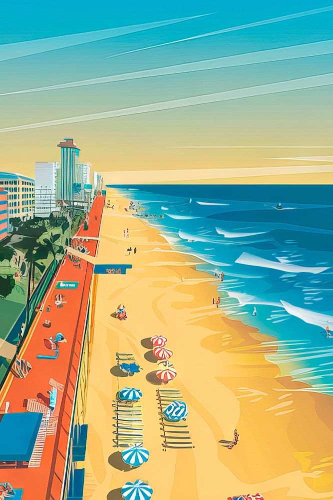 With its vibrant colours and inviting coastal panorama, this work of art radiates the relaxed atmosphere of Virginia Beach. The harmonious combination of sand, sea and parasols creates a feeling of holiday and freedom. Ideal for the living room, it brings holiday memories and a sunny mood to any room.