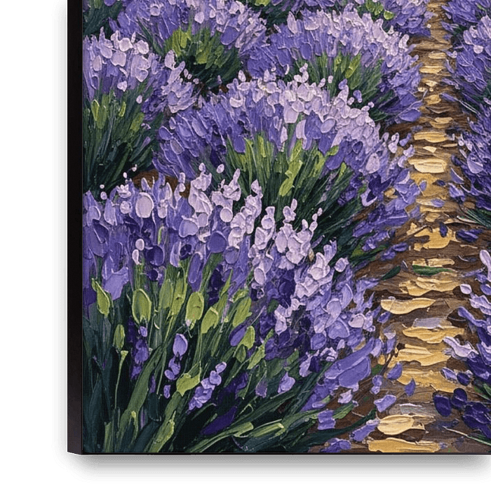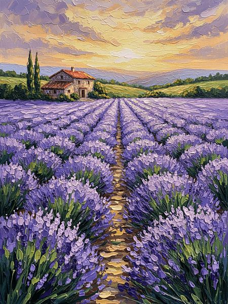 This breathtaking oil painting transports the viewer to a sun-drenched lavender field in full bloom. Using a masterful impasto technique, the artist has sculpted the vibrant violet blossoms with thick, rhythmic palette knife applications, creating a sense of immense texture and depth. Parallel rows of lavender stretch toward a charming,…