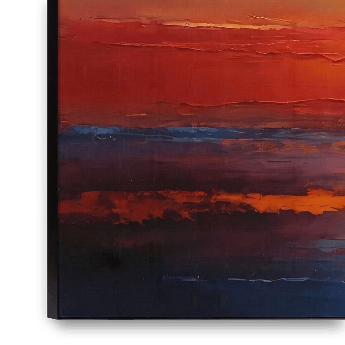 Let your interior shine with this expressive rendering of a sunset. The play of colour and light brings dynamism to any space, with the deep reds and vibrant oranges radiating calm and warmth. The soft transitions between blues and yellows suggest a peaceful evening sky, while the reflection of the setting sun on the water evokes a…