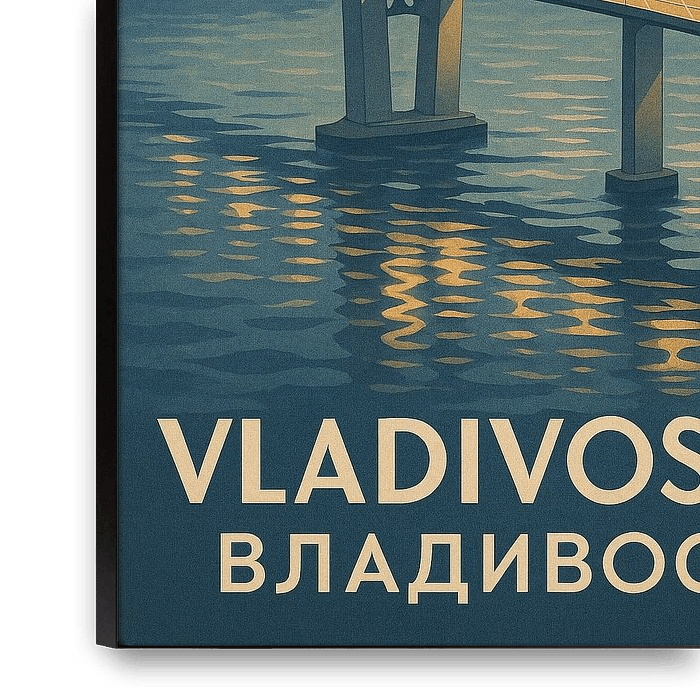 Experience the maritime grandeur of Russia’s Pacific capital with this stunning travel poster of Vladivostok. The artwork showcases the magnificent Zolotoy Rog (Golden Horn) Bridge, its massive V-shaped pylons and cables spanning the bay in a display of modern engineering. The bridge is illuminated against a moonlit night sky, casting…