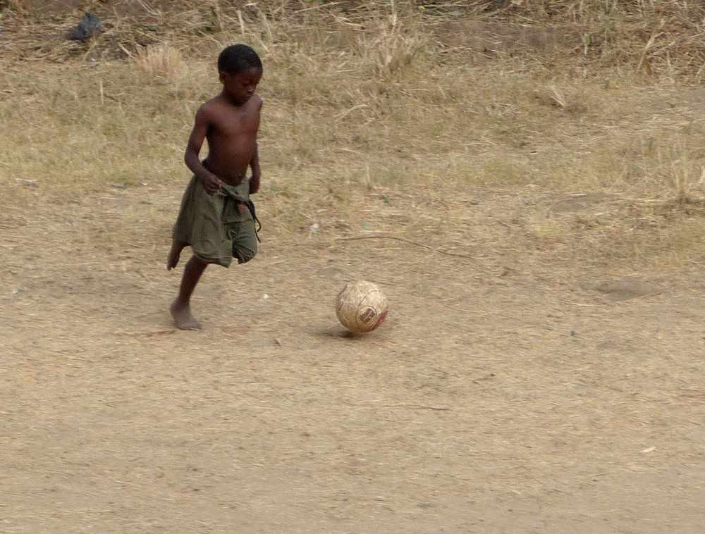 Een jongetje speelt met een voetbal in Tanzania, Afrika.