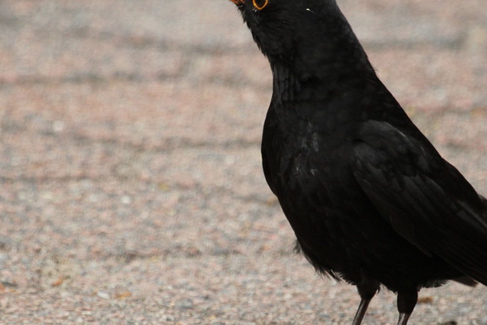 Zwarte vogel merel op straatwerk, kijkt eigenwijs de andere kant op. Oranje snavel, zwarte veren, mannetje.