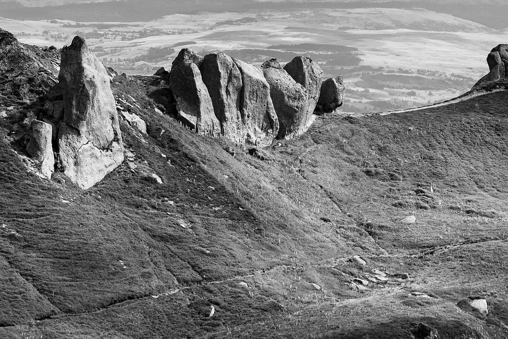Beautiful landscape view looking out over the striking rock formations of Puy Gros, near Super Besse, which is part of the Sancy Massif, in the Volcanoes of Auvergne area of Central France. Summer view with lovely transient light creating dapples of shadow on the mountains.