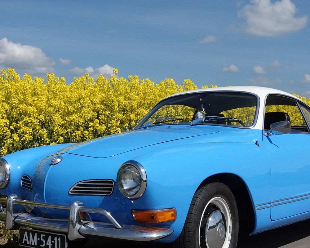 During one of our drives in our own Volkswagen Karmann Ghia, we passed fields full of flowering rapeseed. Stretching metres of bright yellow all the way to the horizon. Because our little car looks so nice, we had to show it off in the spring sunshine.