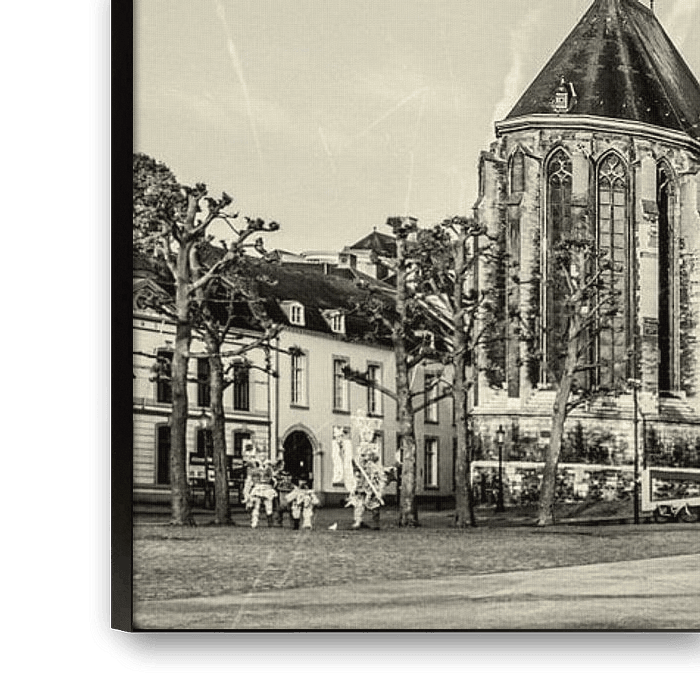Familiar view of the Vrijthof with St John's Church, St Servatius Basilica and the 'Theater aan het Vrijthof' visible in the picture. The work has been converted to a vintage black-and-white look.