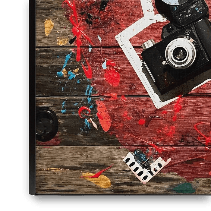 The original work consists of recycled wood from a garden table with acrylic paint and in the centre a vintage photo camera that is the subject of a murder case and itself the victim. Around it are flashbulbs as if they were spent bullets.