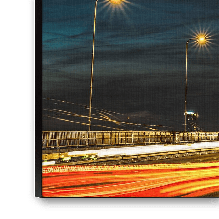 The steel bridge at nightfall. The traffic becomes visible as stripes through the car lamps. The Waal Bridge near Nijmegen is a busy traffic route for traffic in and out of the city. The Waal Bridge is an arch bridge over the Waal that connects the center of Nijmegen with Lent. The bridge is part of the N325 and the city route S100. The bridge is an important connection in the route to Arnhem. The full length of the Waal bridge is 604 meters, and it is about 65 meters high in the middle of the arch. The largest span, the arch itself, is 244.10 meters long, and on completion in 1936 was the longest arc voltage in Europe. In contrast to many other bridges from the same period and with the same construction, such as the IJssel bridge near Zwolle, the John S. Thompson bridge near Grave and the John Frost bridge near Arnhem, the Waal bridge is unique, because it is an arch bridge in the literal sense of the word. ; the transfer of the forces actually rests in the two pillars. A bus lane is located on the western side of the Waalbrug. The bridge has a cycle path on both sides with a narrow pedestrian strip. The bridge was green first, from 1980 it was painted light beige.