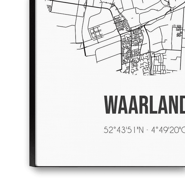 Black and white map, street map or street plan of Waarland. Waarland is located in the municipality of Schagen, province of North Holland. The city map includes all public roads in Waarland. Furthermore, the map features the coordinates of the center of Waarland.