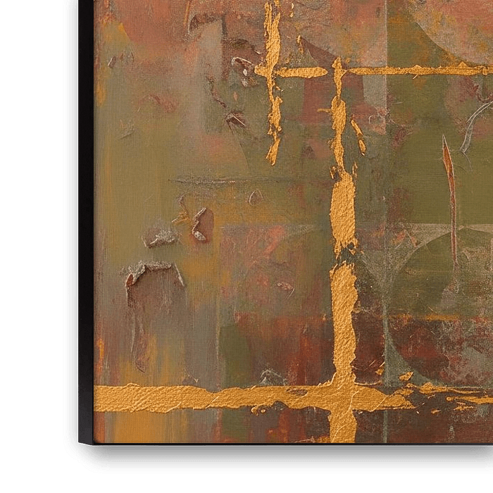 This artwork combines Abstract Geometry with a rich, aged Texture and Luxe accents.
