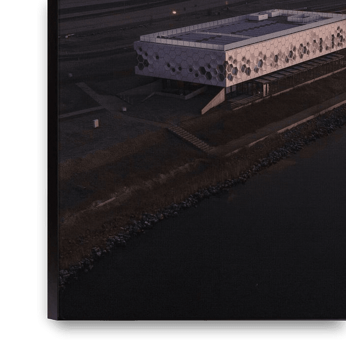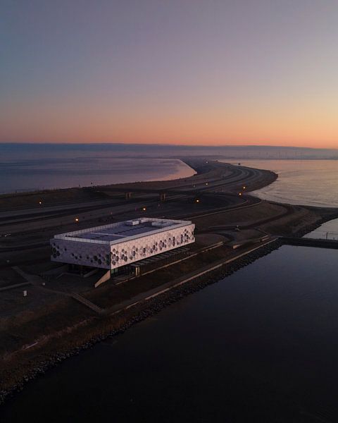 The Wadden Centre on the Afsluitdijk lies here in the quiet of the evening twilight. Seen from the air, the sleek, modern architecture stands out beautifully against the vast expanse of water of the IJsselmeer. The warm glow of the setting sun colours the horizon a soft orange, while the sky slowly transitions into cool shades of…