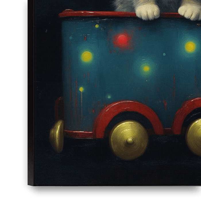 With big eyes, this young kitten looks at you from his colourful toy train. Wagon full of wonder combines the charm of a sweet animal portrait with the nostalgia of classic toys. Its warm fur, contrasting colours and subtle light accents make it an eye-catcher that is both playful and stylish.