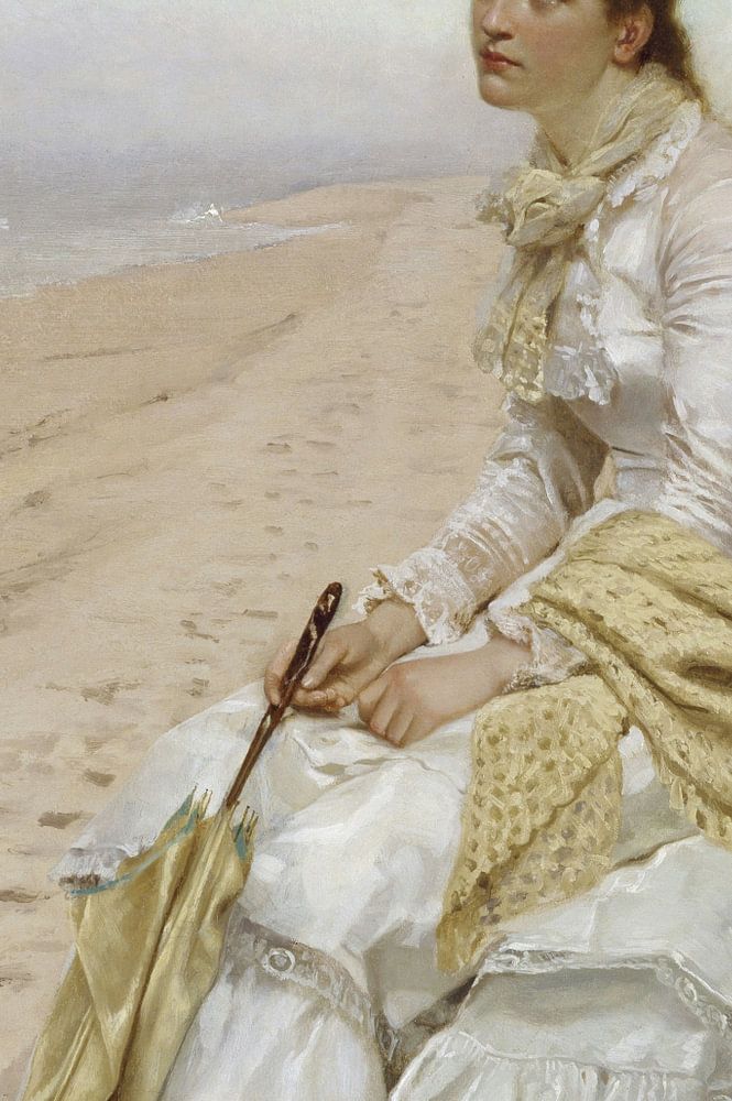 At the same time that he was painting the fishermen of Grand Manan Island in Pull for the Shore (71.552), J. G. Brown was focusing on thematically related images of women seated or standing alone at water's edge and gazing wistfully out to sea. Among the loveliest of these is Waiting for William, in which a beautiful young woman, dressed in her finest clothes, surveys the watery horizon, longing for her beloved to return from the sea. With the point of her parasol, she has written his name -William- in the sand. Is William's return imminent, or is he late in coming home? Has he been lost at sea, never to return?