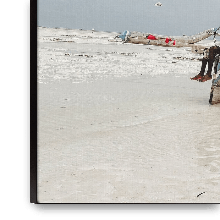 Zanzibar, off Africa's east coast. It was low tide, the water had receded far back. A group of boys waited on their traditional wooden sailboat until the tide came in. The wind still blew against the sail, but it got them nowhere. A contrast between stasis and movement.