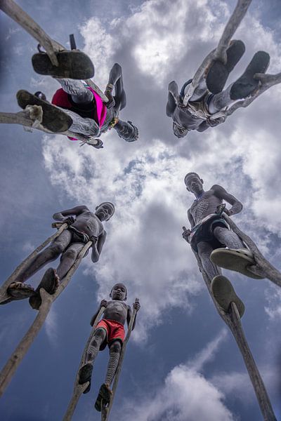 Boys from the Banna tribe in Ethiopia walk on stilts high above the ground. Seen from a low vantage point, they appear to be stepping into the sky, balancing between earth and clouds.