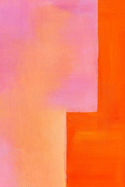 A wall in vibrant orange stands out against an abstract background of delicate orange and pink tones. The minimalist composition and contrasting colours create a striking visual effect and a harmonious, modern abstract impression.…