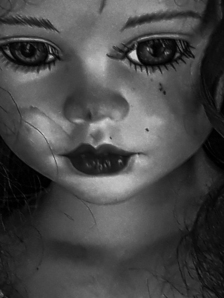 Foto van alleen het hoofdje van een van mijn brocante poppen