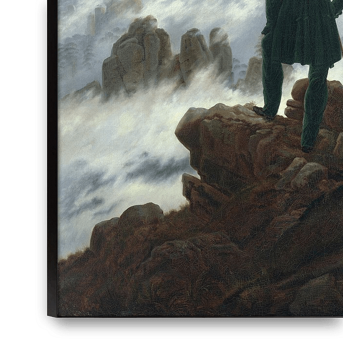The hiker stands as a back figure in the center of the composition. He looks down on an almost impenetrable sea of fog in the midst of a rocky landscape - a metaphor for life as an ominous journey into the unknown.