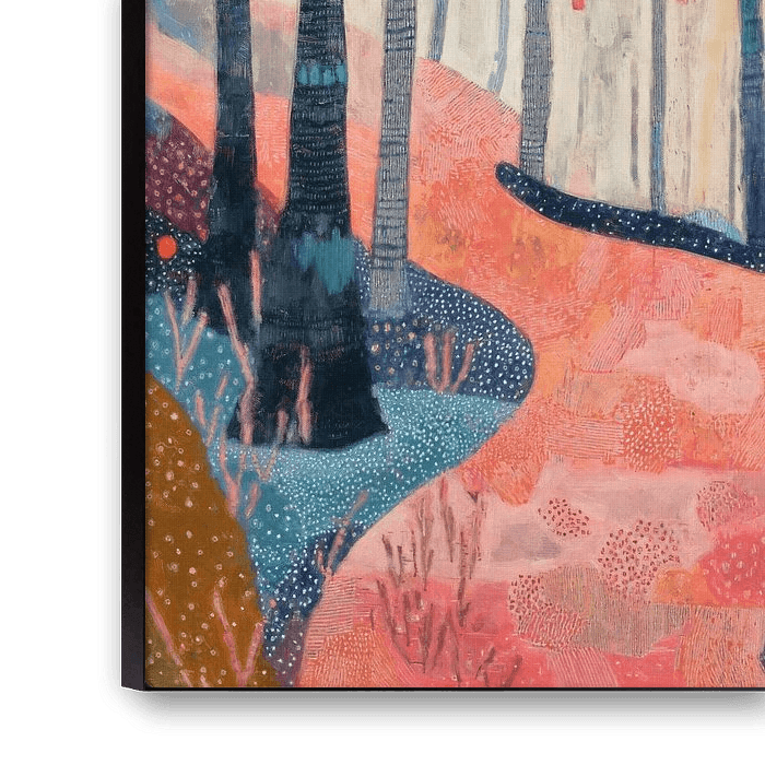 An inviting forest walk on a crisp autumn day, where colours mingle and the air feels like it could get colder at any moment. The trees are taut in their silhouettes, while pink and orange hues line the path. Here you can feel the quiet melancholy of the season - a mix of farewell and anticipation, just what you need sometimes to let your thoughts run wild.