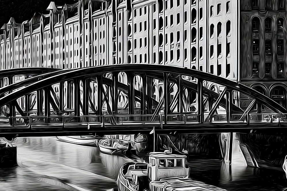 This haunting black and white artwork captures the dramatic atmosphere of a nocturnal scene in Hamburg's Speicherstadt warehouse district. An imposing steel bridge dominates the foreground, its curved arches and delicate construction forming a strong visual anchor. A canal meanders beneath the bridge, on which traditional barges and smaller boats lie calmly in the water or glide slowly along, their reflections mirrored on the slightly moving surface. The characteristic brick buildings of the Speicherstadt rise up along the canal, their numerous rows of windows creating a fascinating texture and emphasising the historical significance of the location. The sky is deep black and is dramatically punctuated by a brilliant flash of lightning, which bathes the scene in a ghostly light and creates an electrifying tension. The monochrome image emphasises the contrasts between light and shadow and lends the picture a timeless, almost melancholic quality. The combination of architectural beauty, maritime activity and the natural spectacle of the thunderstorm creates a captivating composition that captures both history and the raw power of nature. It is a tribute to the iconic Hamburg harbour landscape, which is given a new, dramatic interpretation in this work. The painting invites the viewer to feel the stillness and subliminal energy of this special night.