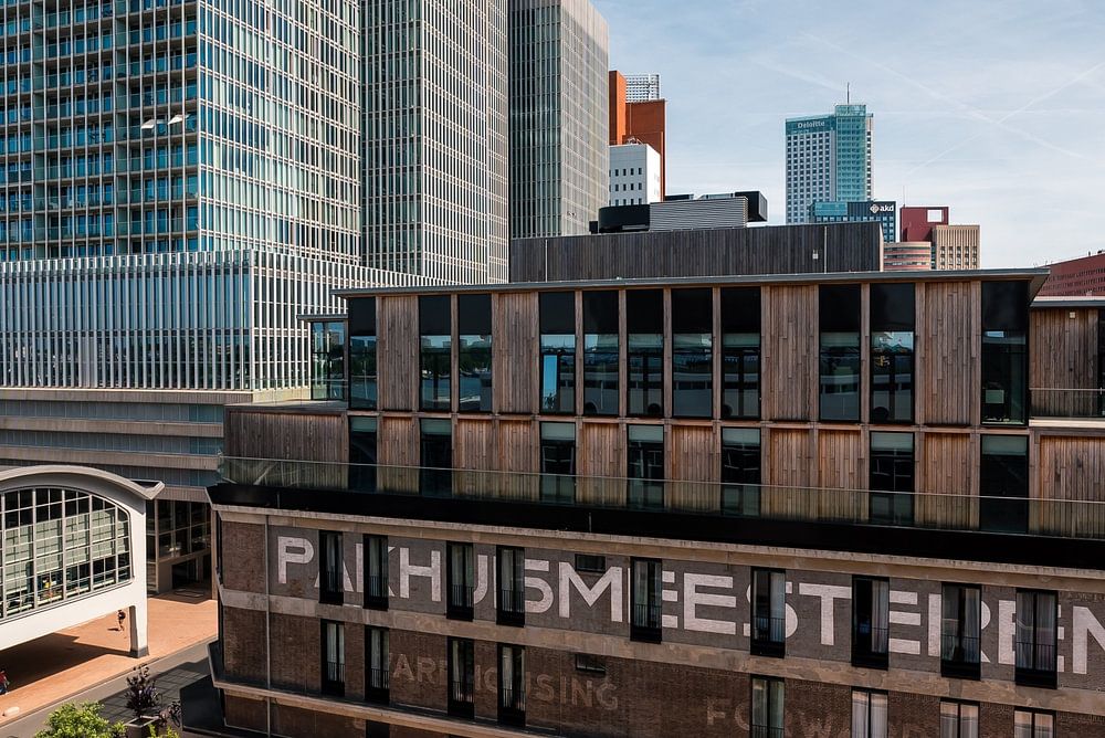 Beautiful black and white photo of the Warehouse with extreme cloud cover behind it. The long shutter time allows you to see movement in the clouds.