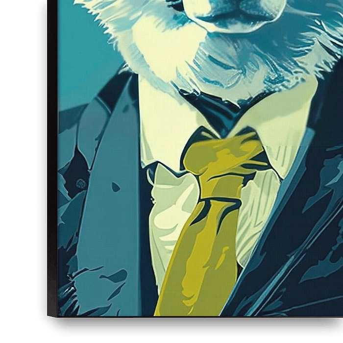 We see three corgi's, each dressed in a sharp suit with a tie, and presented against a background of contrasting but harmonious colours.