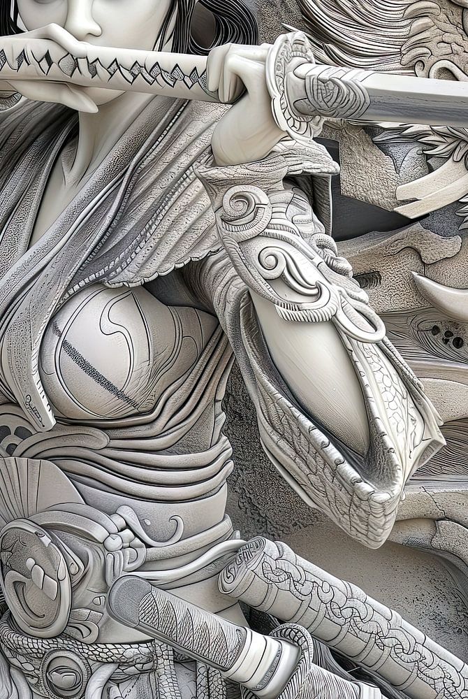 This digital drawing shows the sculpture of an Asian warrior in medieval armour with a drawn sword. The clear lines and details capture the martial grace and majesty of the figure. The armour and sword symbolise strength, bravery and determination. The warrior's expression radiates determination and readiness to fight. The abstract elements of the drawing lend the scene an additional dimension of movement and energy. This depiction invites the viewer to be inspired by the warrior's powerful beauty and determination.