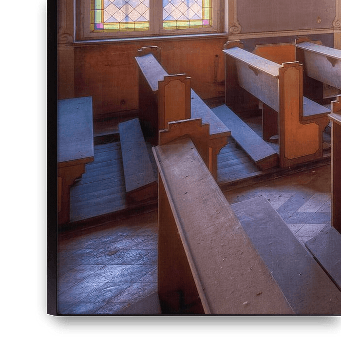 This is a photo of sundown settling in causing soft and warm light to fill this beautiful abandoned church in a large forgotten building somewhere in Poland.