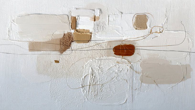 This artwork depicts an abstract composition built up from layered forms, rich textures and natural tones. The image consists of rectangular and organic shapes in colours such as white, beige, sand, brown and soft earth tones. The paint appears to have been applied in thick, expressive layers, creating a tactile texture. Thin dark lines…