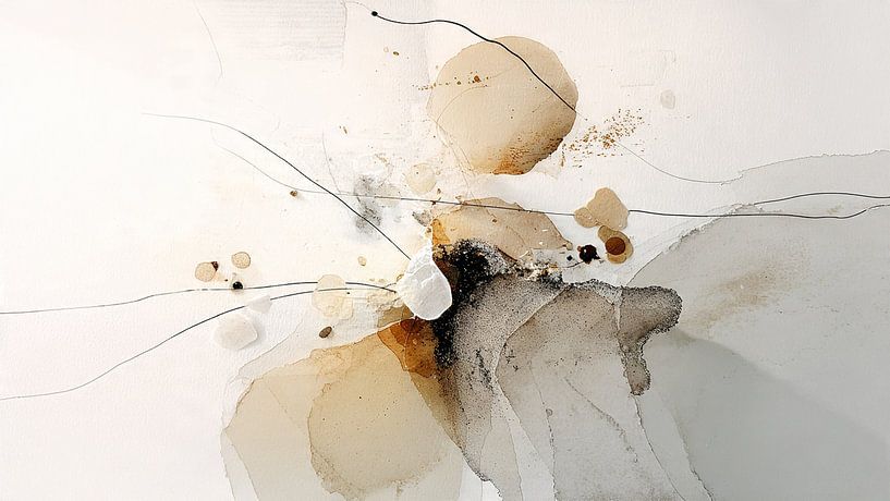 This artwork depicts an abstract composition built up from overlapping rectangular and organic shapes in soft, natural tones. The image consists of areas of colour in beige, brown, grey, off-white and warm earth tones, which together form a harmonious and layered structure. Thin black lines run through the composition, moving…