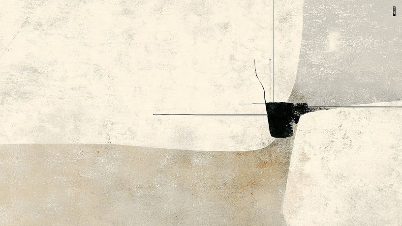 This artwork depicts an abstract composition in which shapes, lines and textures come together to form a modern and harmonious whole. In the centre is a dark shape intersected by clean vertical and horizontal lines. These lines create structure and contrast within the softer, organic background. The background consists of neutral tones…
