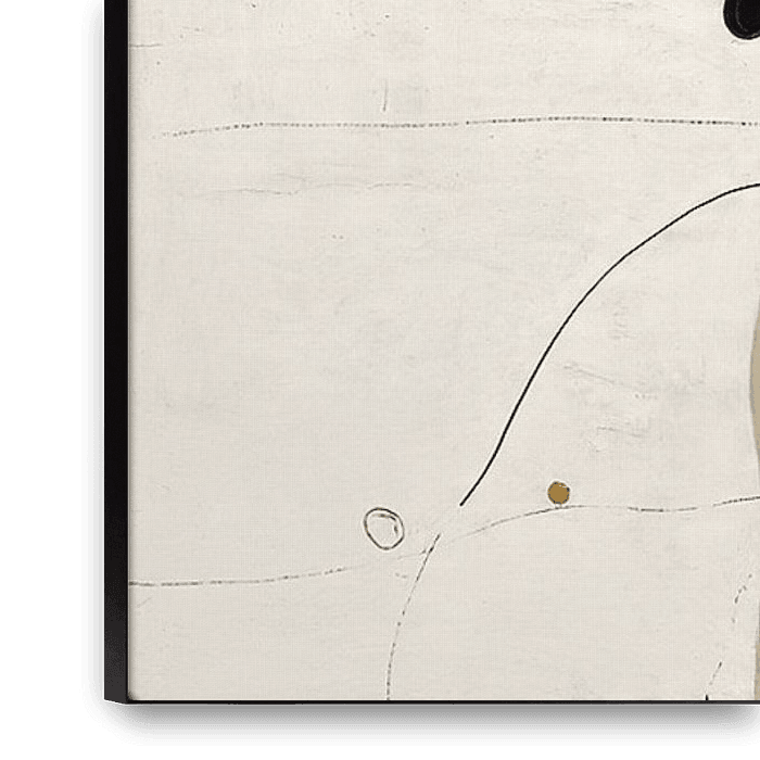 This artwork depicts an abstract composition of organic shapes and lines against a soft, off-white background. The image consists of various circular and oval elements in shades of beige, brown, black and grey. These shapes subtly overlap and vary in texture, creating a sense of depth and movement. Thin, graceful black lines meander…