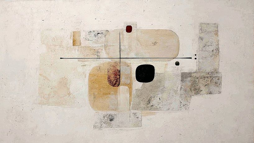This artwork features an abstract composition of geometric and organic shapes that together form a modern and harmonious whole. At the centre, a vertical and a horizontal black line stand out, forming a cross-like element that lends structure to the composition. Surrounding these are rounded rectangles, circular elements and soft areas…