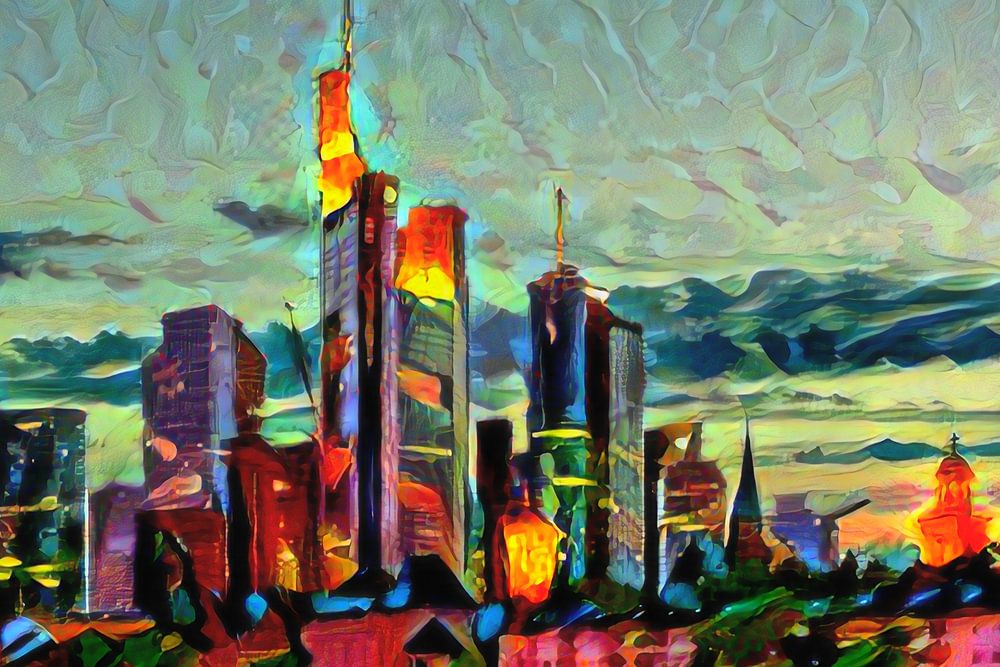 With artificial intelligence we created a modern artwork of the Frankfurt skyline. The warm colors show a romantic evening in Frankfurt. Our algorithm learned the painting style expressionism and applied it to the cityscape of Frankfurt am Main. This is how we combine human creativity and the unprecedented possibilities of technology!