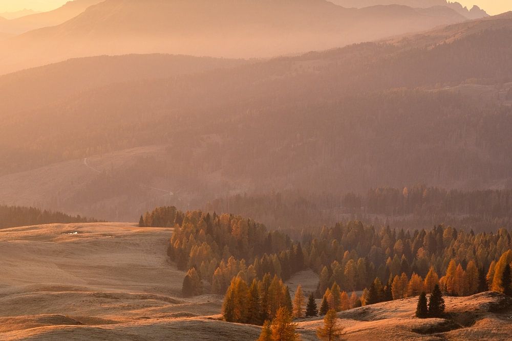 In autumn, the larch trees turn a beautiful yellow and orange in the Dolomites. The Dolomites are majestic mountains in Italy. An impressive region. The last sunlight shines into the valley, creating beautiful soft light.