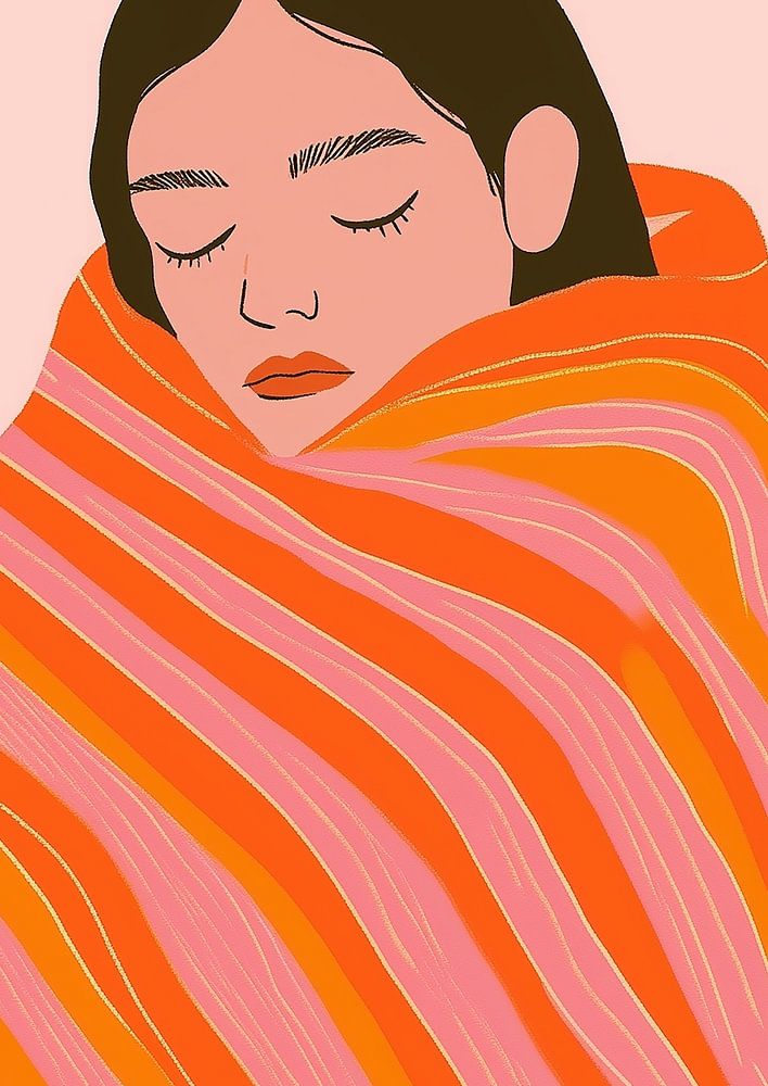 An illustration of a woman wrapped warmly in an orange and pink striped blanket, set against a soft pink background. The style of the drawing is simple and charming, using flat illustrations with bold lines and few details. This contributes to a minimalist aesthetic that emphasises clarity and simplicity. The warm colours of the blanket contrast subtly with the calm background, giving the whole composition a soft, inviting feel.