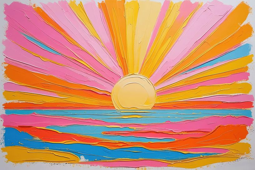 A round sun rises above a calm sea line, while broad palette knife strokes radiate outwards in fan pattern. Thick impasto layers create tactile ridges and subtle shadows. Warm tones of sun and sky contrast vividly with cool strips across the water. The composition is bright and optimistic, with a clear horizon and rhythm in the paint…