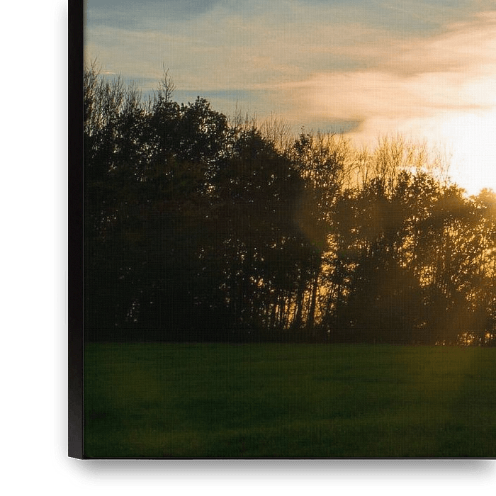 Buy this landscape artwork Warm sunlight behind trees at dawn with wide endless green meadow by adventure-photos on canvas, ArtFrame, poster and wallpaper, printed on demand in high quality.