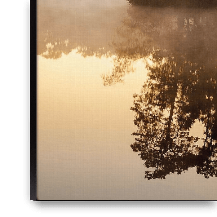 In the golden glow of early dawn, an enchanting spectacle unfolds. The sun's rays glisten like golden harp notes, while the silhouettes of majestic trees stand out against the serene landscape. An island of solitude in the middle of the water, enveloped by a mysterious mist floating gently above the lake.