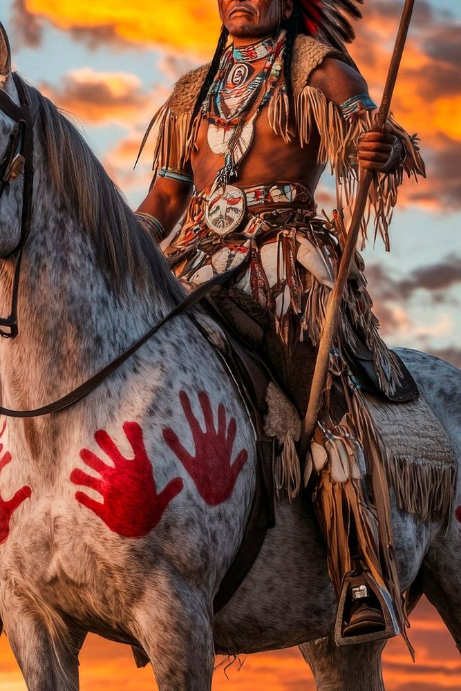 A majestic warrior sits enthroned on a brilliant white horse, while warm light bathes the sky in vibrant colours. The striking red hands on the horse tell stories and traditions, while the warrior with his magnificent feathered headdress and spear embodies the strength and pride of his heritage. An image full of history and resilience.