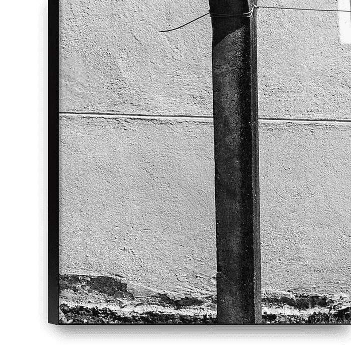 Buy this abstract artwork Washing line in front of a white façade by Flatfield on canvas, ArtFrame, poster and wallpaper, printed on demand in high quality.