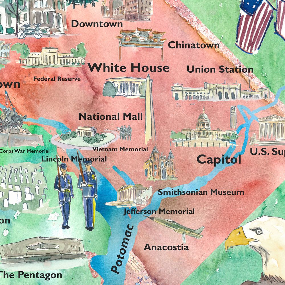 Buy Washington DC USA Illustrated travel posters Favorite map Tourist Highlights by Markus Bleichner on canvas, ArtFrame, poster and wallpaper, printed on demand in high quality.
